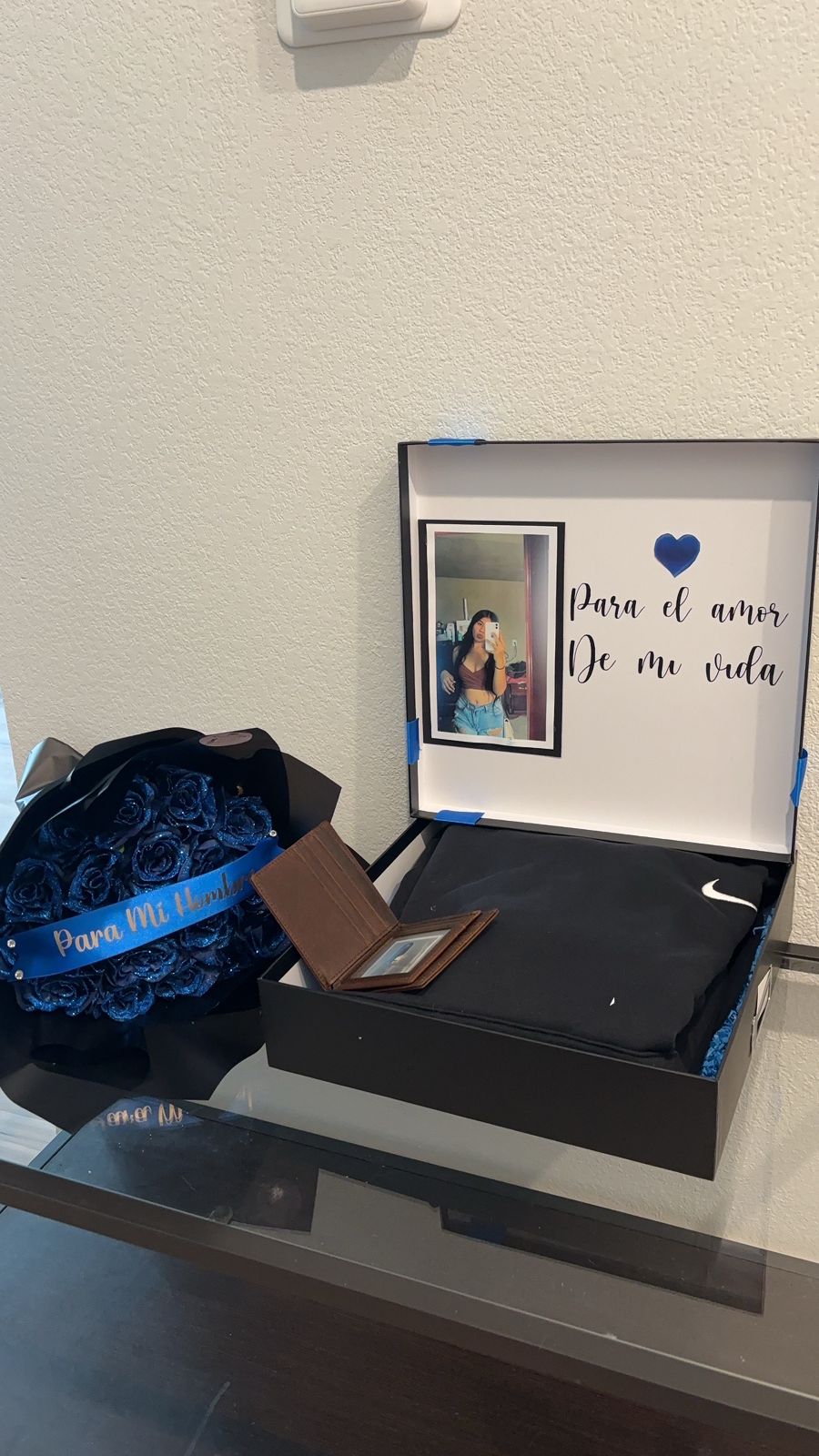 Cajita personalizada con una cartera fotos sudadera Nike original ramo de 25 rosas artificiales